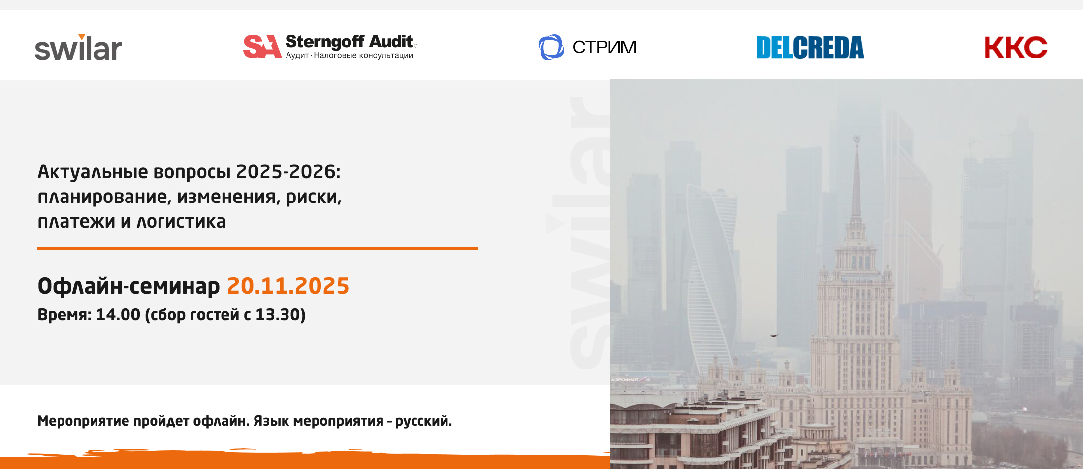 группа компаний swilar совместно с аудиторской компанией Sterngoff Audit, международной консалтинговой компанией STREAM, компанией DELCREDA и логистической компанией ККС приглашают Вас на офлайн-семинар на тему: