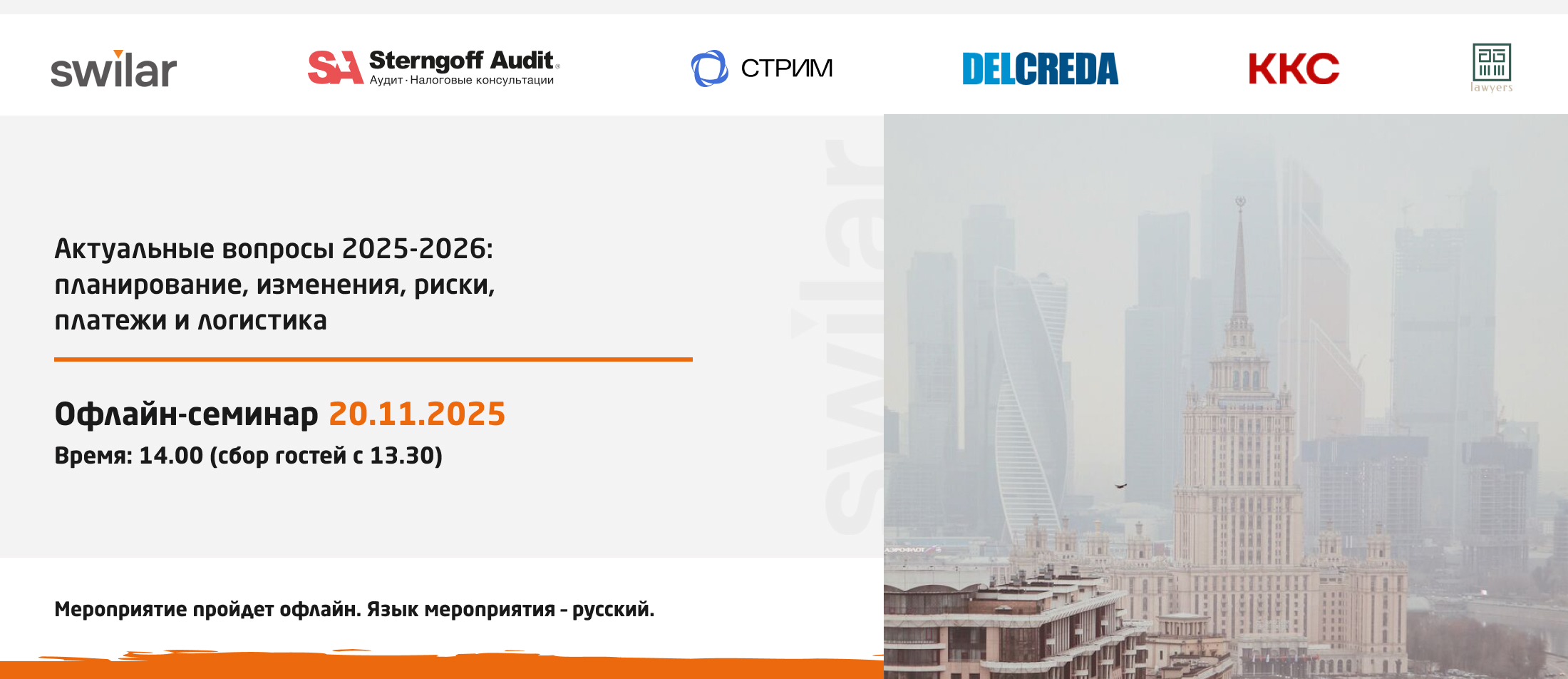 группа компаний swilar совместно с аудиторской компанией Sterngoff Audit, международной консалтинговой компанией STREAM, компанией DELCREDA и логистической компанией ККС приглашают Вас на офлайн-семинар на тему: